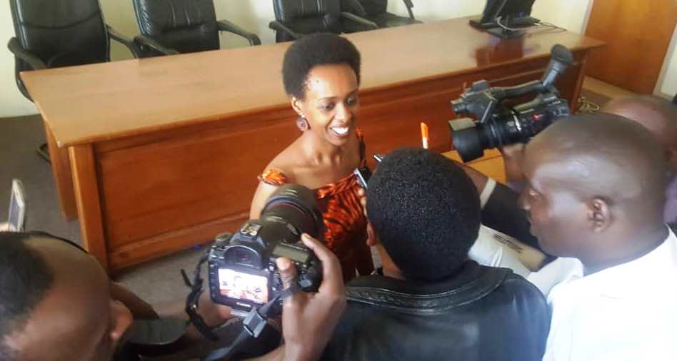 Diane Rwigara agaragaza ibyishimo aseka avugana n’abanyamakuru