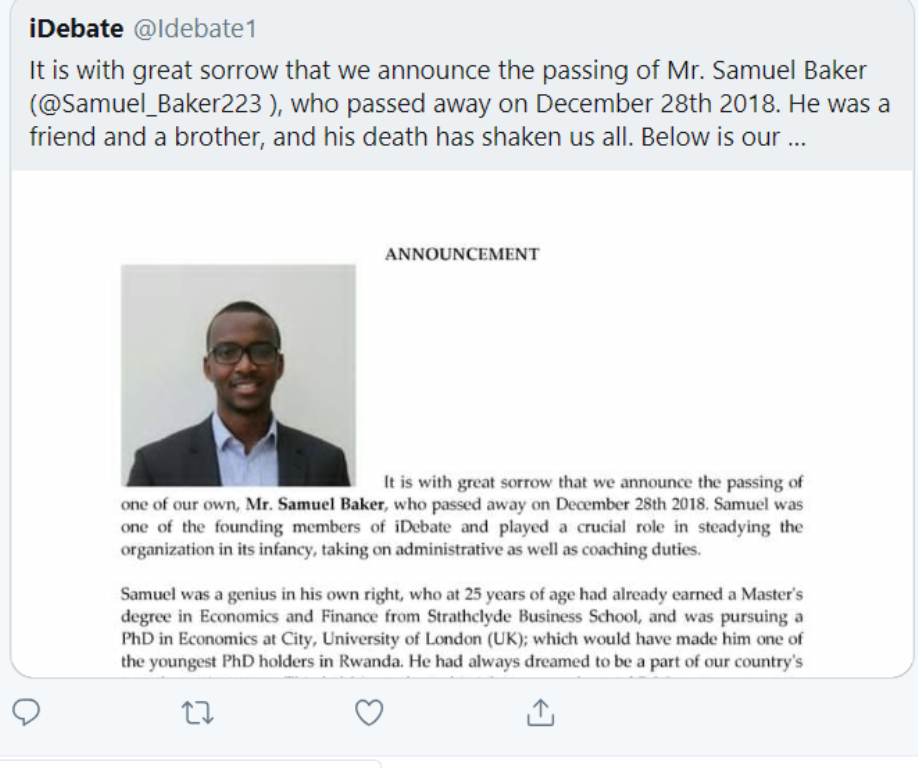 Inkuru y’urupfu rwe yatangajwe n’uwitwa Twahirwa aho abinyujije kuri Twitter ye, yavuze ko umuryango wa Baker umaze kumenyeshwa ko yitabye Imana arohamye.