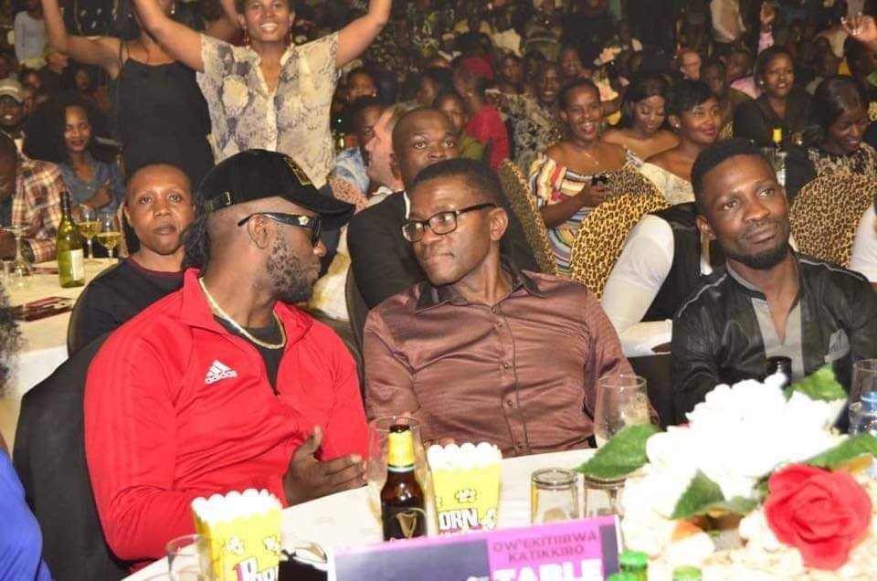 Bebe Cool wambaye umutuku hagati Katikilo Peter Charles Mayiga na Bobi Wine bicaranye mu gitaramo cya Eddy Kenzo muri Serena hotel