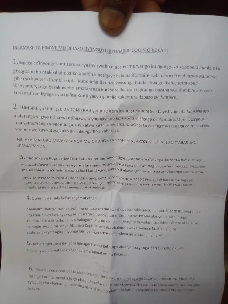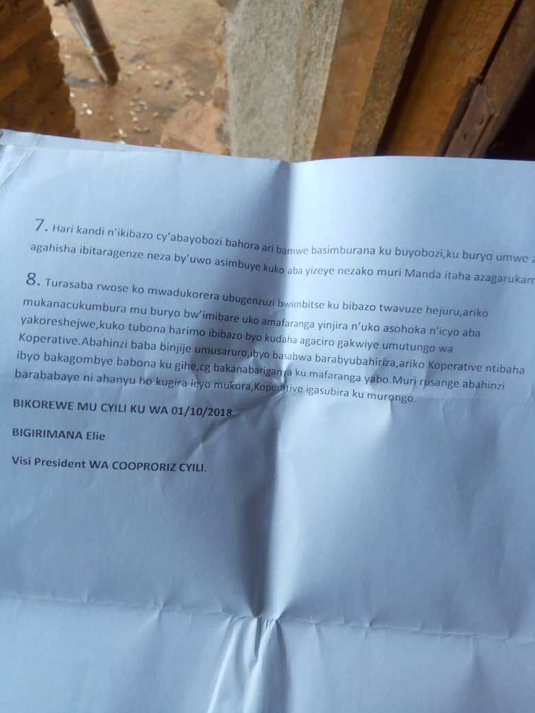Undi mubo batwavuganye yavuze ko abayobozi bubatse akazu ko kurya imitungo yabo kuko ngo umuyobozi wabo iyo manda y’imyaka 3 irangiye ajya kuyobora U.C.R.B cyangwa ubu yitwa Union ,uwayoboraga Union akaza kuyobora Koperative gutyo gutyo basimburana basahura imitungo y’abahinzi.