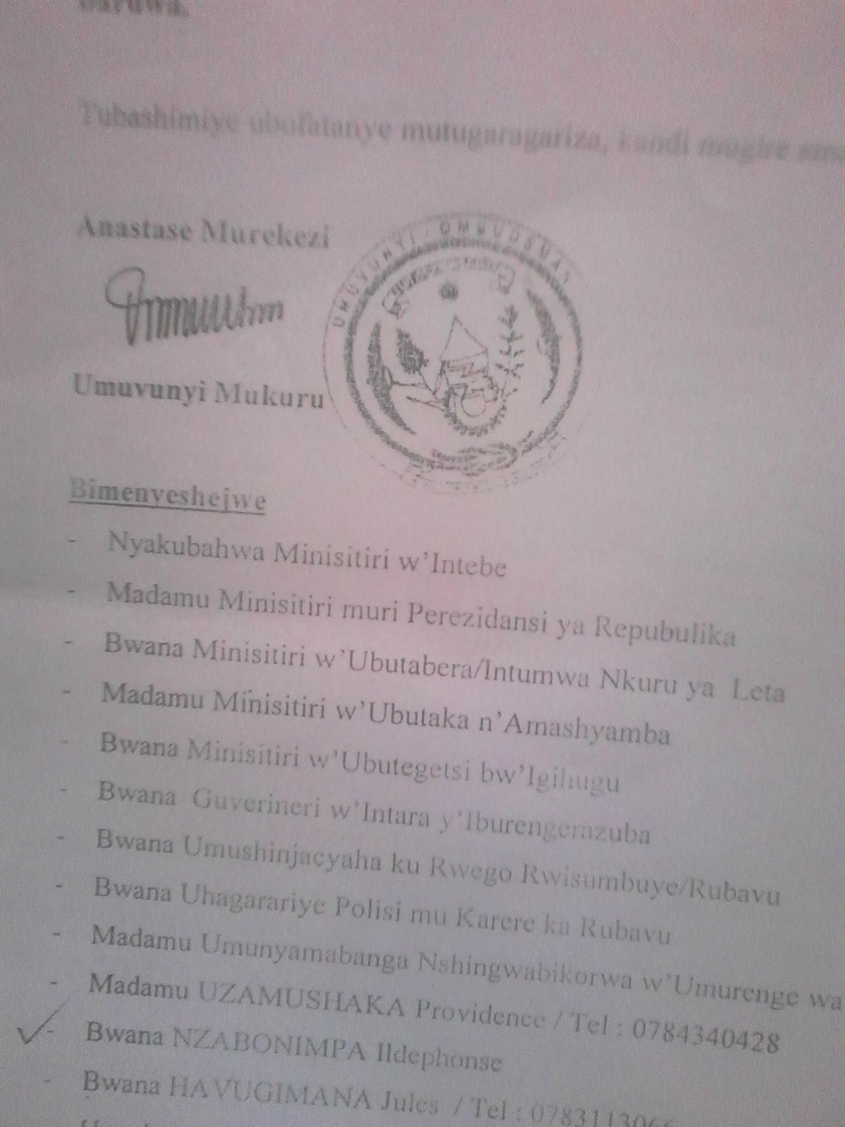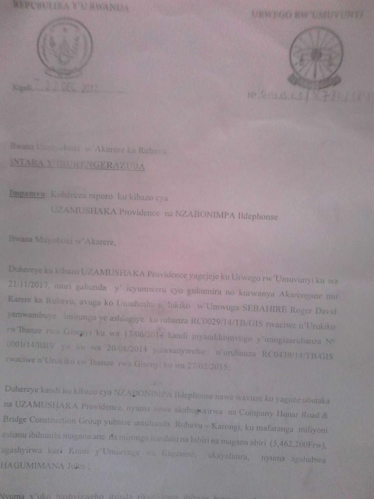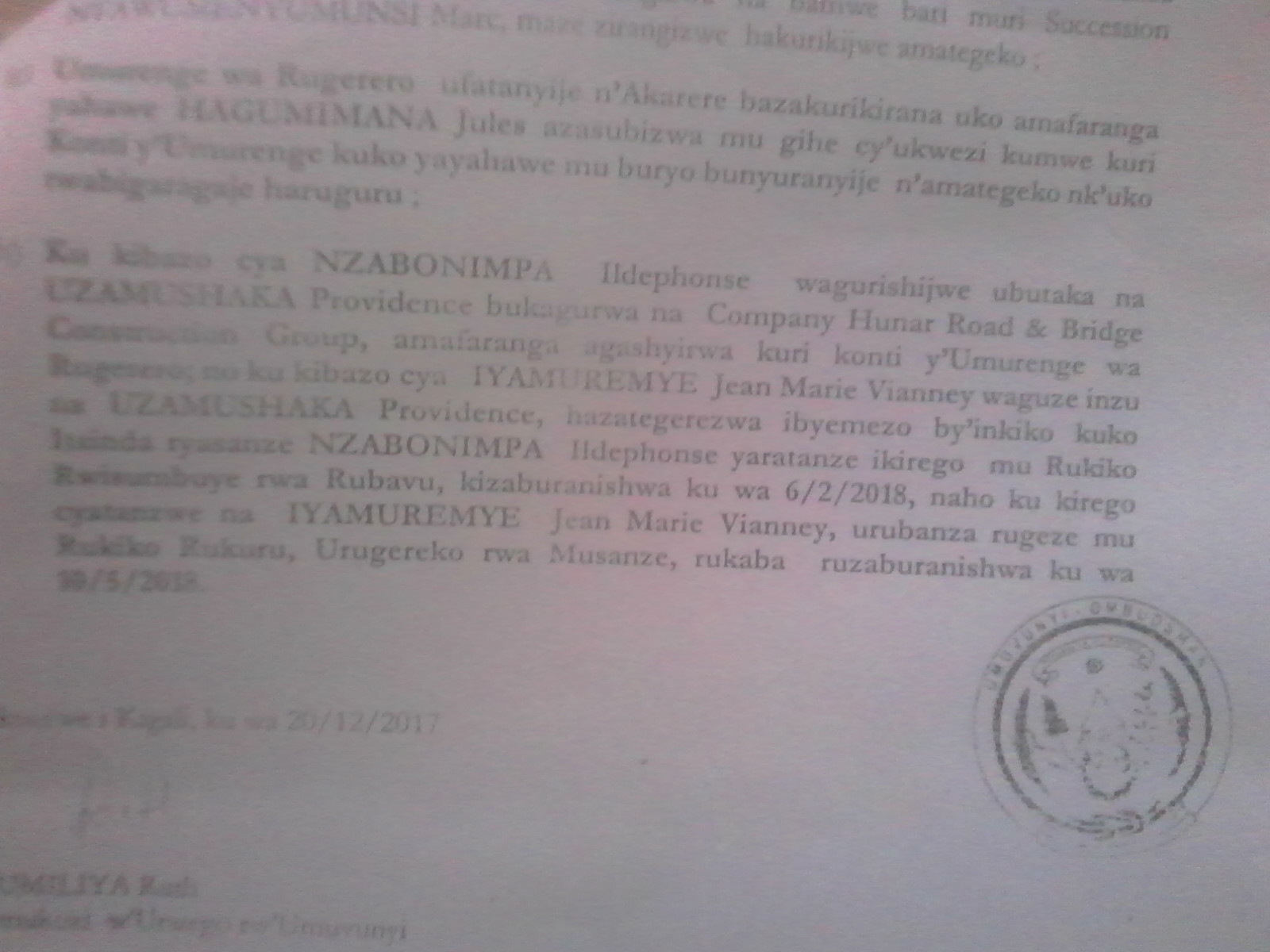 Igitangaje ni uko kopi dufite igaragaza Hagumimana Jules asinyira ubuyobozi ko Uzamushaka Providance ari uwo mu muryango wo kwa Ntwumenyumunsi Marc witabye Imana ndetse na se wa Jules arasinya n’abandi bagabo bari bahari ariko aca inyuma atangira kumurega ko atari uwo kwa Ntawumenyumunsi Marc ubwo ibyo bifatwa gute mu bayobozi no mu Nkiko ?.