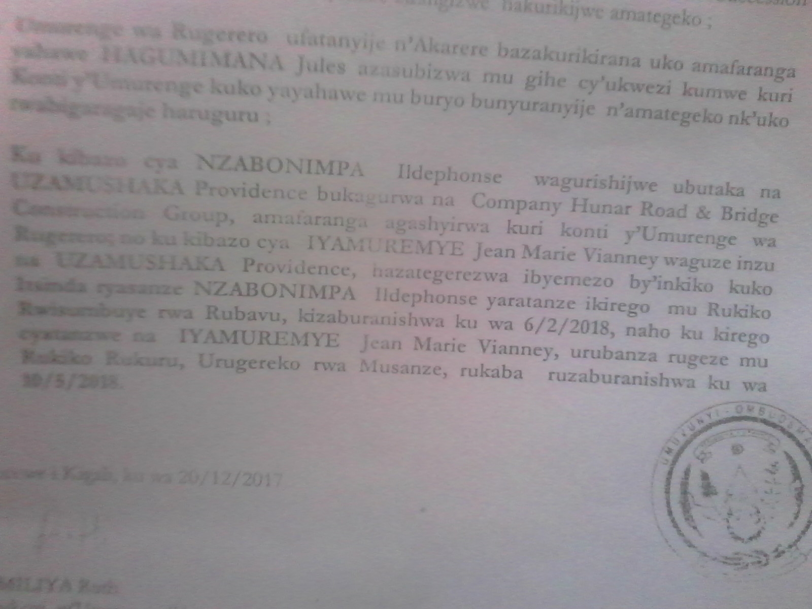 Muri kopi ikinyamakuru Umusingi gifite y’urwego rw’umuvunyi ku kibazo cya Jules Hagumimana ushaka guhagararira umuryango wo kwa Ntawumenyumunsi Marc ivuga ko Jules Hagumimana adafite uburenganzira bwo gucunga iyo mitungo ahubwo urwego rw’umuvunyi rwari rwamuhaye ukwezi kumwe kuba yazanye urwandiko rusinyweho n’abagize umuryango bose kandi bikanyuzwa muri Ambasade y’uRwanda mu bihugu batuyemo kandi akagaragaza imyirondoro yabo.