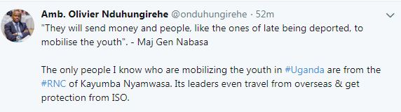 Minisitiri Amb.Olivier Nduhungirehe yahise yandika kuri twitter ye aho yavuze ko abashaka guhirika ubutegetsi bwa Museveni babinyujije mu rubyiruko ari RNC ya Gen.Kayumba Nyamwasa.