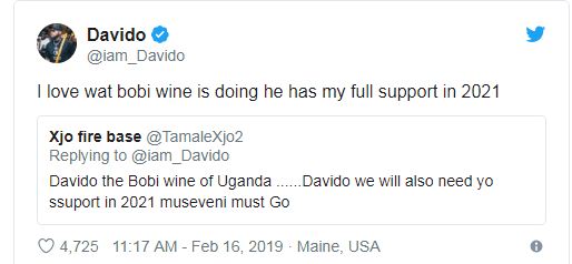Davido yanditse kuri Twitter ati “Nkunda cyane ibyo Bobi Wine ari gukora, afite ubufasha bwanjye bwose mu 2021.” Yabivuze asubiza umufana wari umubajije niba ntacyo yakora ngo ashyigikire Bobi Wine “kuko Museveni akwiye kugenda!”