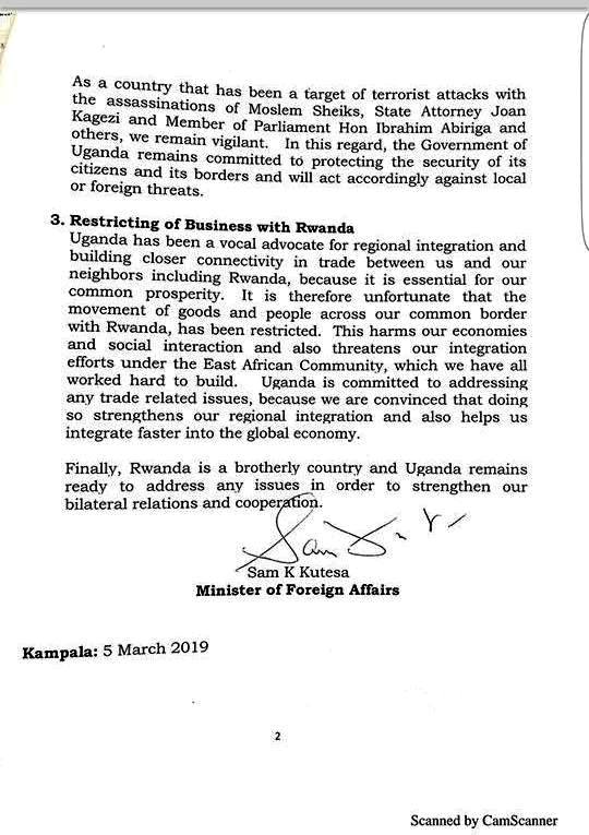 Mu itangazo rya Minisitiri w’Ububanyi n’Amahanga wa Uganda Sam Kutesa ibi byose akaba yabihakanye avuga ko nta bantu bo muri RNC bakorana na Uganda ndetse avuga ko u Rwanda rubizi neza ko ikibazo cy’uRwanda na Uganda ari ikibazo cyo gucyemurwa mu ibanga kandi ku rwego rwo hejuru atari ikibazo cyo kujya mu itangazamakuru.