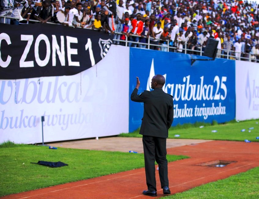 Gen. Mubaraka Muganga, Umuyobozi wungirije w’ikipe ya APR FC wari wicaye mu myanya y’icyubahiro , yaje kuhagera maze asaba aba bafana gutuza no kurangwa n’ikinyabupfura mu bimenyetso yakoraga nabo bamuhanze amaso.