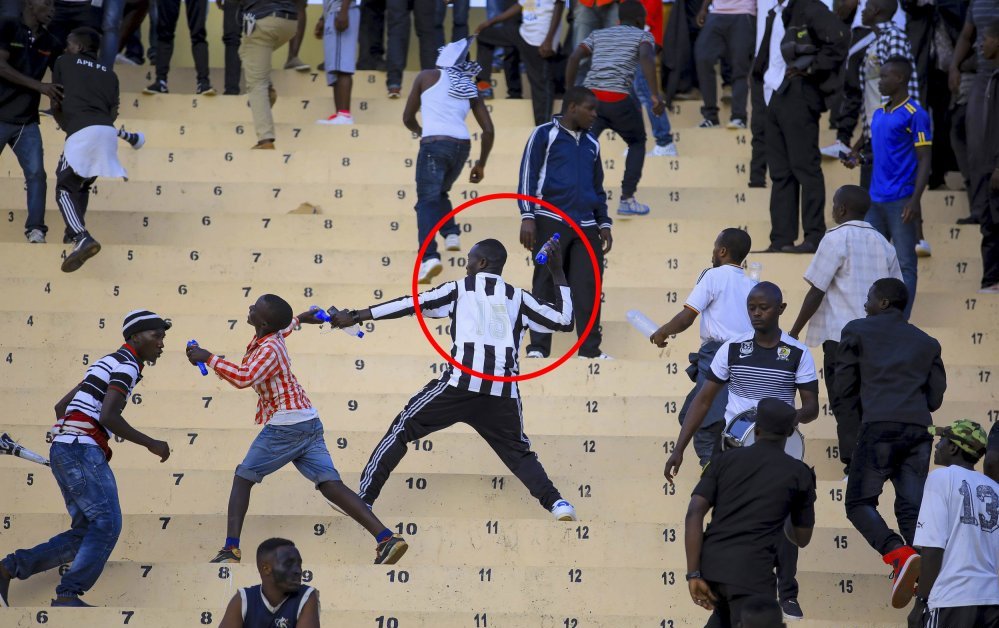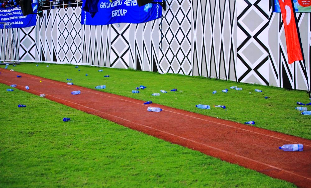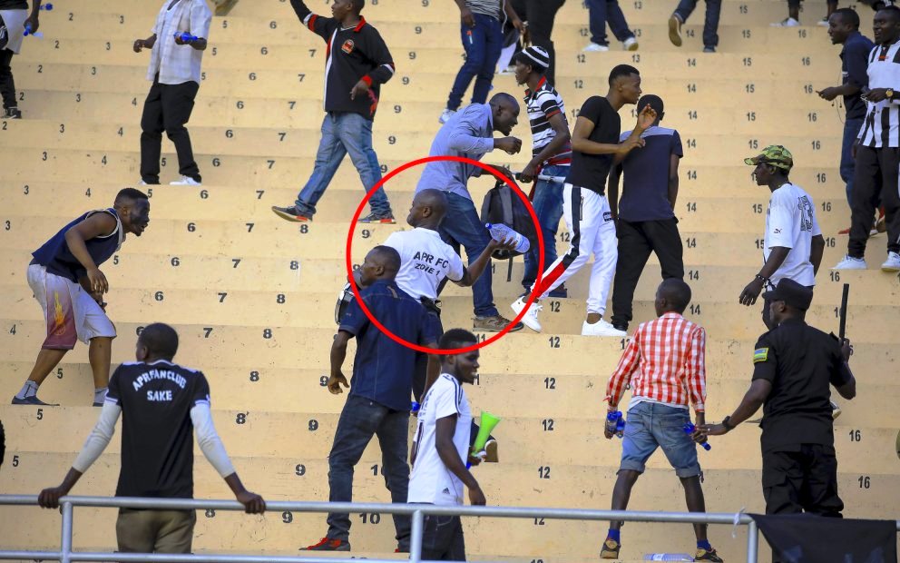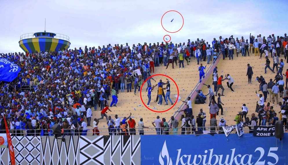 Mu gihe rutahizamu Sarpong ndetse na myugariro w’iburyo Iradukunda Eric ‘’Radu’’ bakuragamo imyenda yo hejuru bishimira igitego cy’intsinzi, ni nako abafana ba Rayon Sports nabo batangiye gutera amacupa y’ibinyobwa bitandukanye mu gice cyari kirimo bafana ba APR FC maze nabo barabasubiza, ubushyamirane butangira ubwo.