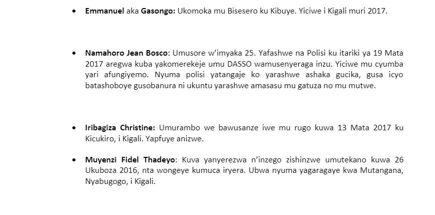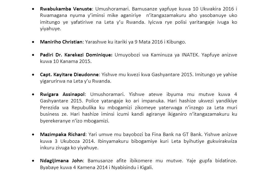 Yabajijwe bamwe mu bantu avuga ko bishwe harimo umucungagereza Mwiseneza Jean Paul na CSP Gashagaza Hubert n’abandi aho inzego zishinzwe umutekano zavuze ko umucunga gereza uvugwa yishwe n’abantu bataramenyekana ndetse na Gashagaza yasanzwe yanigiwe mu modoka ye yapfuye kandi inzego zishinzwe umutekano zikavuga ko zirimo gukora iperereza we akaba yemeza ko bishwe aho abikura kandi ataravuganye na Muganga ngo abyemeze.