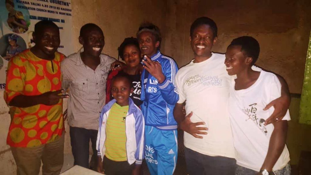 Umuhanzi Dan Runyange wambaye umweru afashe umugore ku rutugu ,Kanyombya wambaye ubururu ,Ibumoso ni Pasiteri Nsengiyumva bakunda kwita Mafuta na Pasiteri Peter