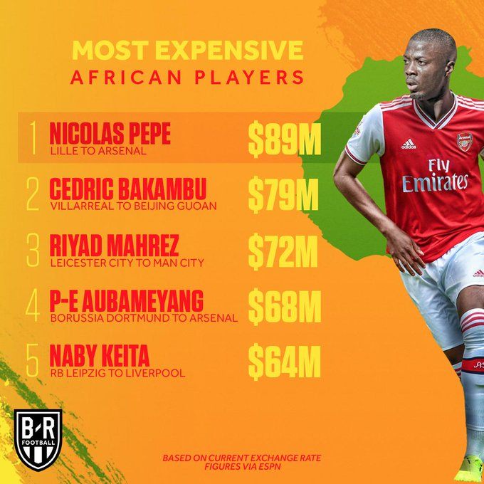 Nicolas Pepe n’umunyafurika w’umukinnyi wa mbere uhenze akaba yaguzwe amafaranga £72m ,Arsenal ikaba yamuguze mu ikipe ya Lille akaba yasinye amasezerano yo kuyikinira imyaka 5.