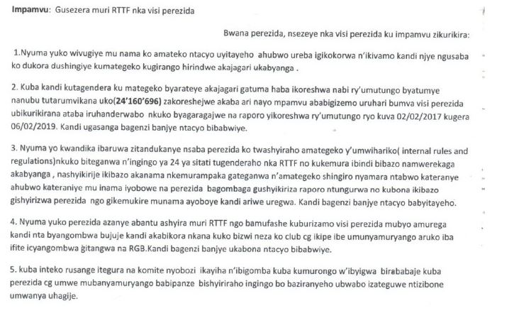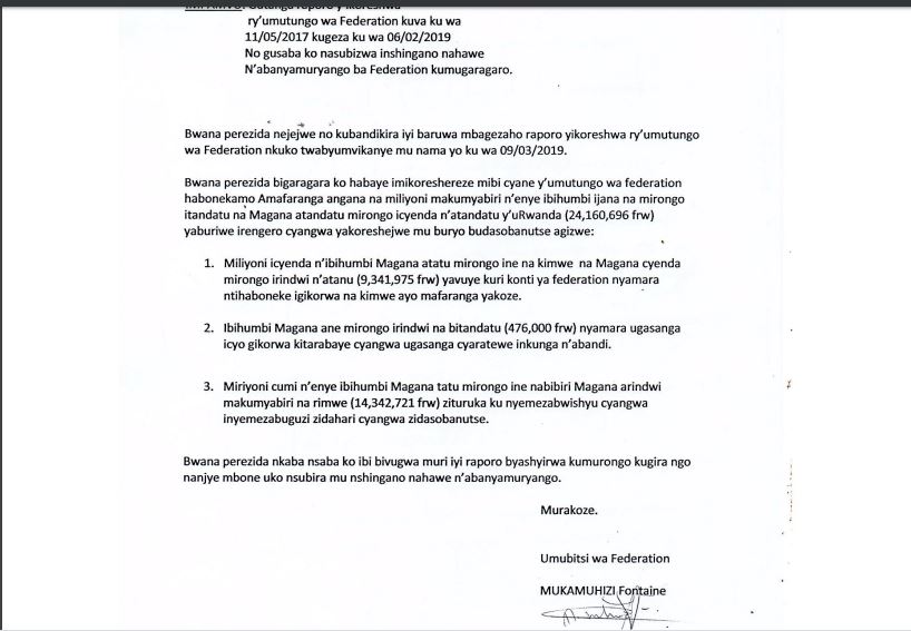 Amwe mu magambo yanditse muri iyo baruwa ndende inagaragaza uburyo hari amafaranga yinjiye kuri Konti y’iri Shyirahamwe iri muri Banki ya Kigali (BK) harimo Konti y’Amadolari n’ijyaho amafaranga y’u Rwanda, ayo magambo agira ati “Bwana Perezida bigaragara ko habaye imikoreshereze mibi cyane y’umutungo wa Federation”.