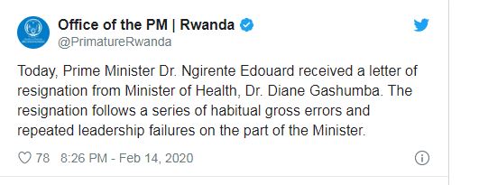 Itangazo ryaturutse mu biro bya Minisitiri w’Intebe rivuga ko ‘Minisitiri w’Intebe, Edouard Ngirente, kuri uyu wa Gatanu yakiriye ibaruwa y’ubwegure ya Minisitiri w’Ubuzima, Dr Diane Gashumba. Ubwegure bwe bukurikiye amakosa akomeye ahoraho no kunanirwa kuzuza inshingano z’ubuyobozi ku ruhande rwe nka Minisitiri’.