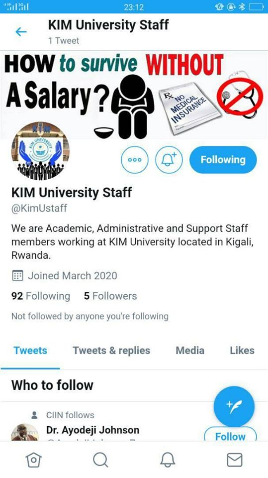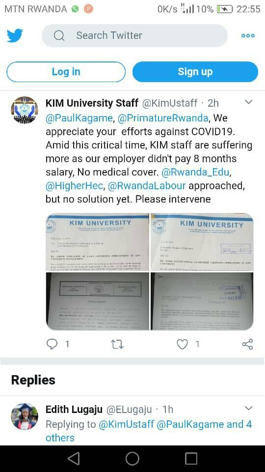Twitter y’abaakozi ba Kaminuza ya KIM ivuga ko bandikiye inzego zitandukanye zirimo ikigo gishinzwe abakozi n’umurimo ndetse na HEC n’izindi zitandukanye bazimenyesha ikibazo cyabo ariko ko ntaa gisubizo bahawe bityo bakaba bafite impungenge uko bazabaho muri ibi bihe byo kuguma mu rugo mu rwego rwo kwirinda Corona Virus badafite ikibatunga basaba Perezida ko yabatabara ikibazo cyabo kigakemuka.