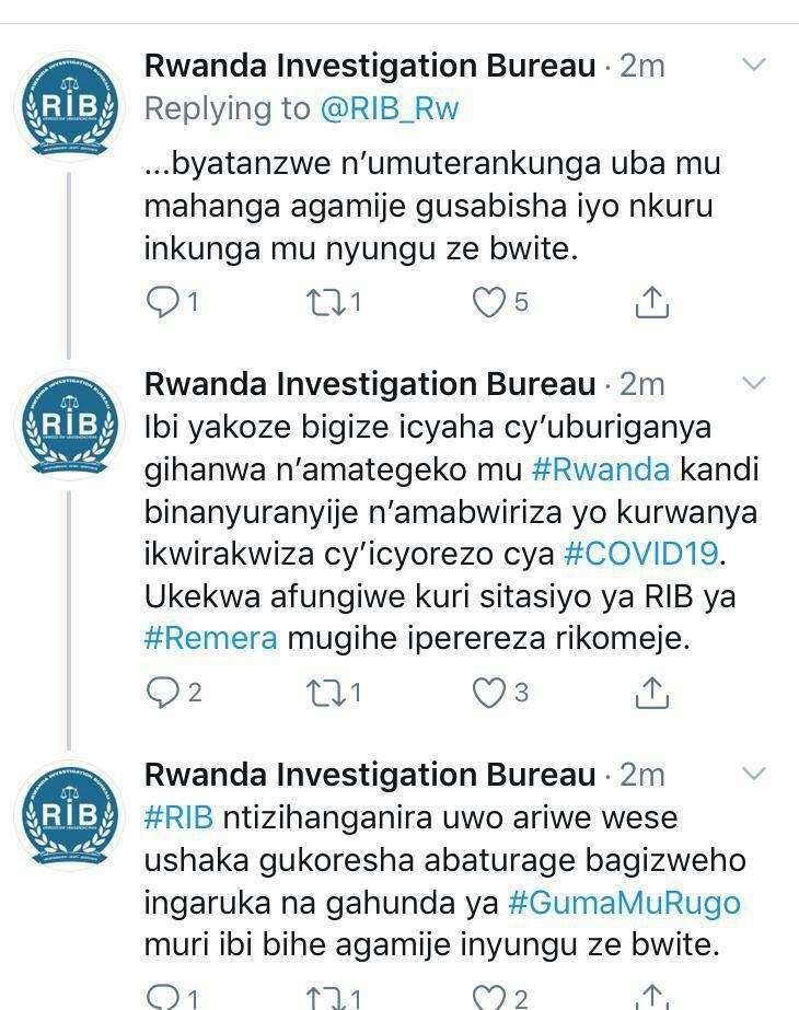RIB ivuga ko “Ibi yakoze bigize icyaha cy’uburiganya gihanwa n’amategeko mu Rwanda kandi binanyuranyije n’amabwiriza yo kurwanya ikwirakwiza ry’icyorezo cya Coronavirus. Ukekwa afungiwe kuri sitasiyo ya RIB ya Remera mu gihe iperereza rikomeje.”