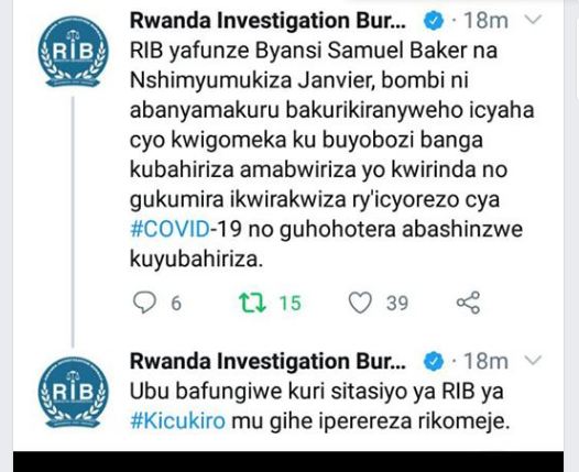 Mu butumwa bwashyizwe ahagaragara na RIB yavuze ko “yafunze Byansi Samuel Baker na Nshimyumukiza Janvier, bombi ni abanyamakuru bakurikiranyweho icyaha cyo kwigomeka ku buyobozi banga kubahiriza amabwiriza yo kwirinda no gukumira ikwirakwiza ry’icyorezo cya #COVID-19 no guhohotera abashinzwe kuyubahiriza.”