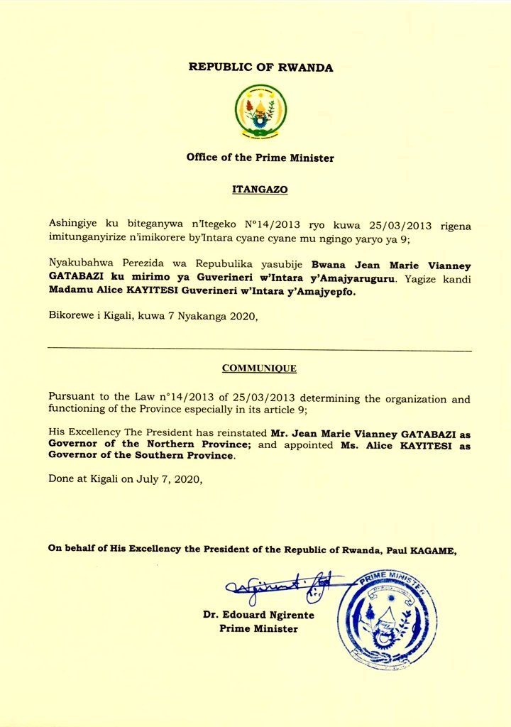 Rigira riti “Nyakubahwa Perezida wa Repubulika yasubije Bwana Jean Marie Vianney Gatabazi ku mirimo ya Guverineri w’Intara y’Amajyaruguru. Yagize kandi Madamu Alice Kayitesi Guverineri w’Intara y’Amajyepfo.’’