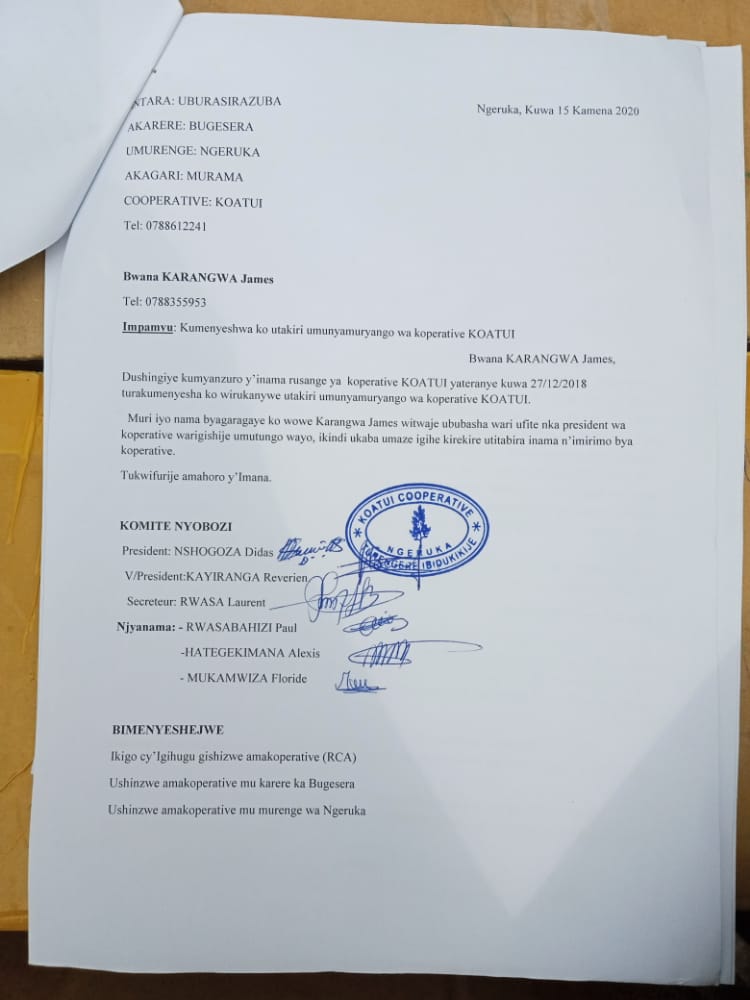 Urwandiko rwirukana Karangwa James muri Koperative kubera ibyaha byo kunyereza umutungo