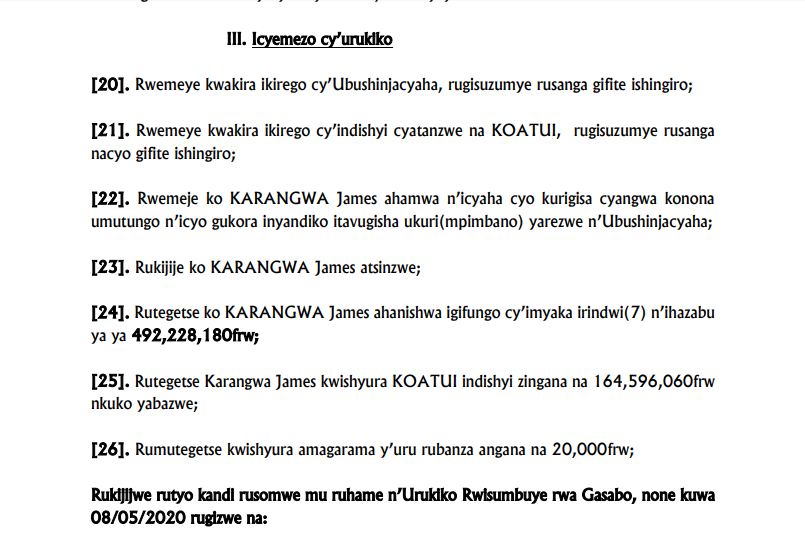 Umwanzuro w’urubanza rwa Karangwa James ushinjwa ibyaha byo kunyereza umutungo wa Koerative ariho bashingira bashinja abayobozi itonesha n’ivangura n’ikimenyane kuko ngo nawe yakabaye atakiri mu buyobozi bwa ADEPR
