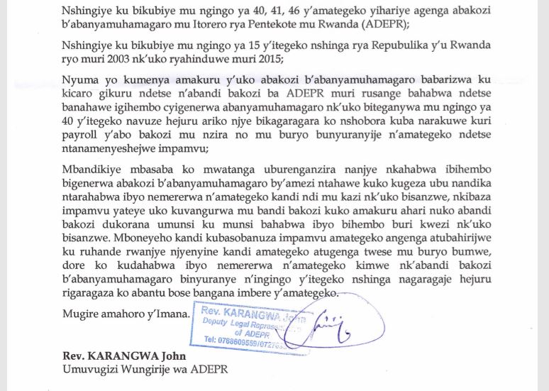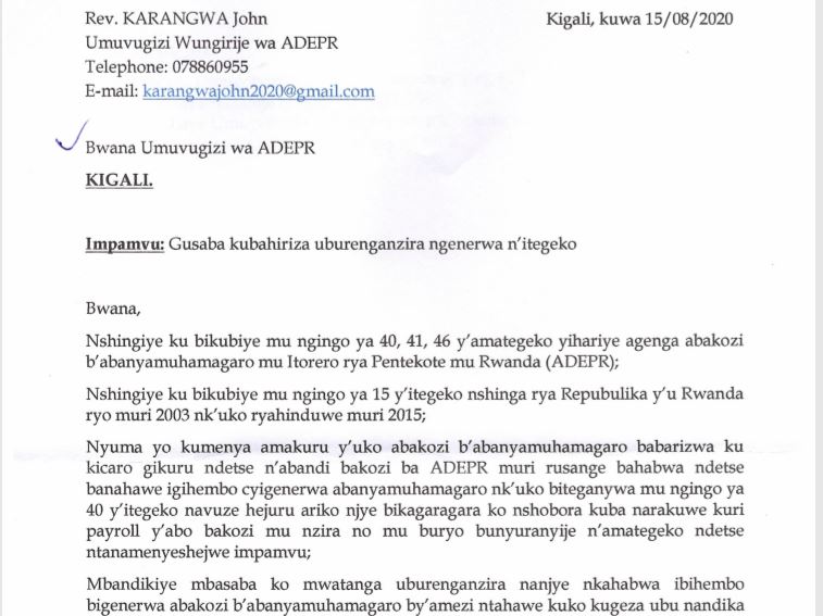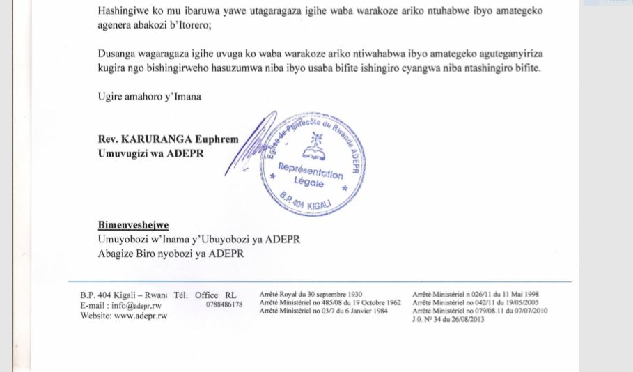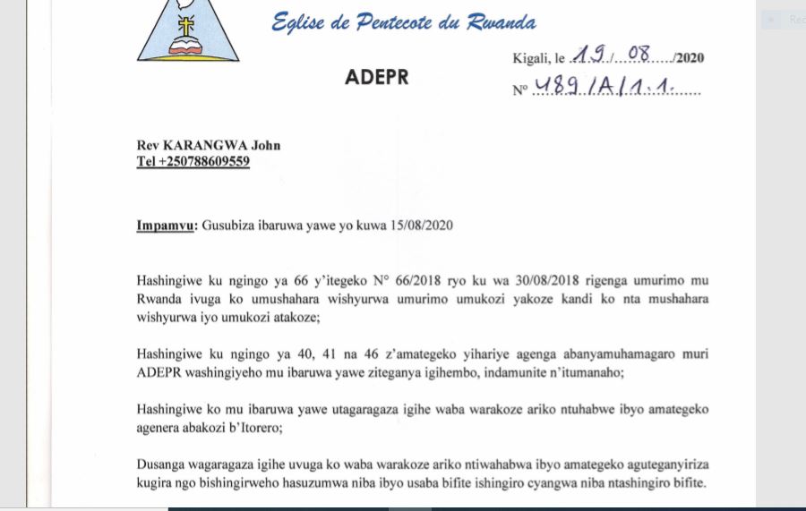 Uko bigaragara ni uko Rev.Karangwa John yandikiwe n’Umuvugizi mukuru Rev.Karuranga Ephrem amusaba kumugaragariza ko yabaye umwe kugirango ikibazo cye kigweho.