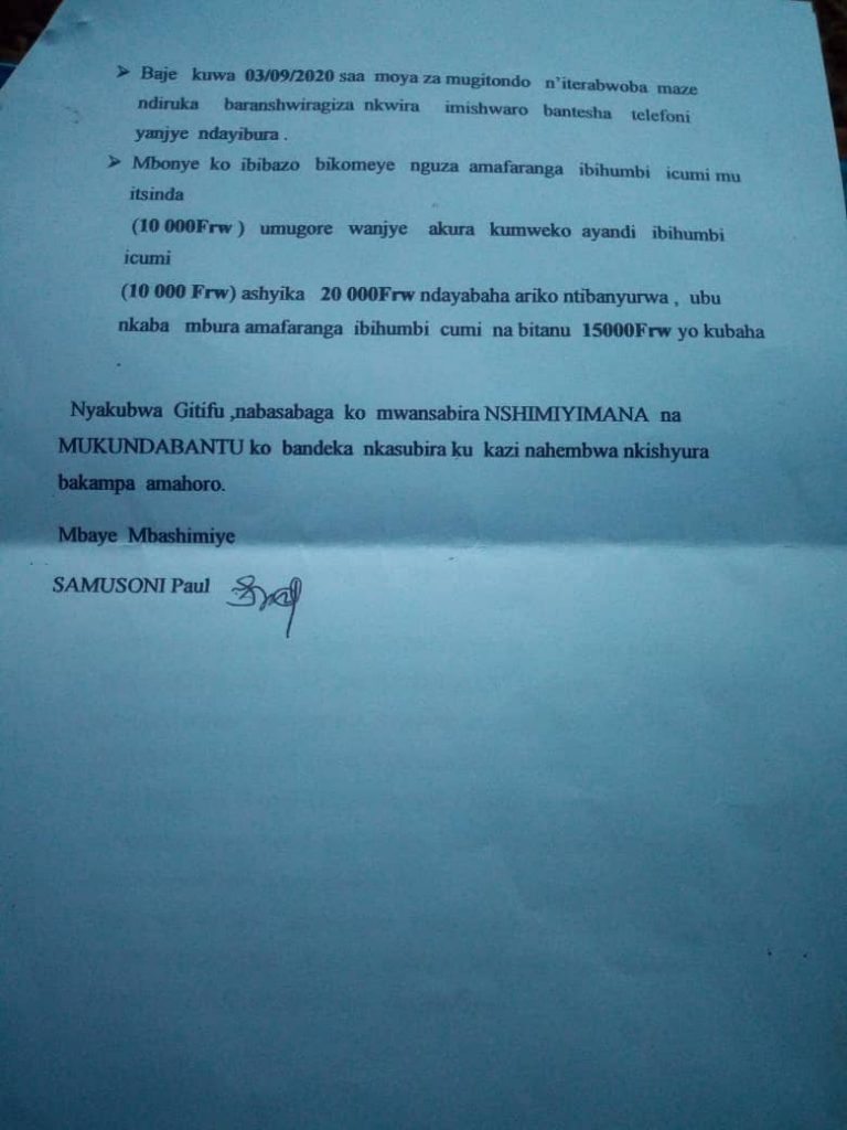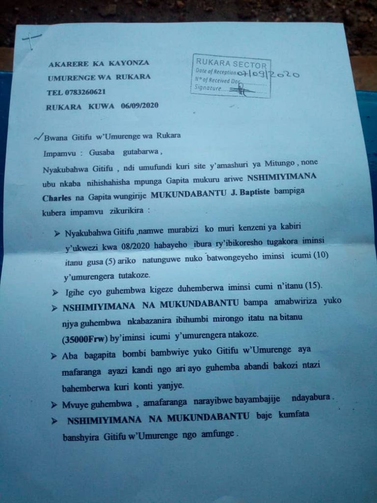 Kuwa 7 Ukwakira 2020 nibwo umuturage witwa Samson Paul yatangarije Ikinyamakuru Umusingi ko yakoze iminsi 5 agahembwa iminsi 15 hanyuma ba gapita Nshimiyimana na Mukundabantu bakaza kubasaba amafaranga y’iminsi 10 irenga ku minsi 5 babaga bakoze kugirango bayashyire gitifu Nkunzurwanda John .Samson Paul yagize ati “Twagiye guhembwa batubwira ko twahembwe iminsi 15 ariko amafaranga y’iminsi 10 tuyabikuza tukayaha gapita kubera ko ndi umufundi nkorera ibihumbi 3500 ubwo iminsi icumi yarengagaho nagombaga kubaha ibihumbi 35.000Rfw ngo bakayashyira gitifu w’Umurenge wa Rukara ngo kuko ari ayo gufasha abana batishoboye .