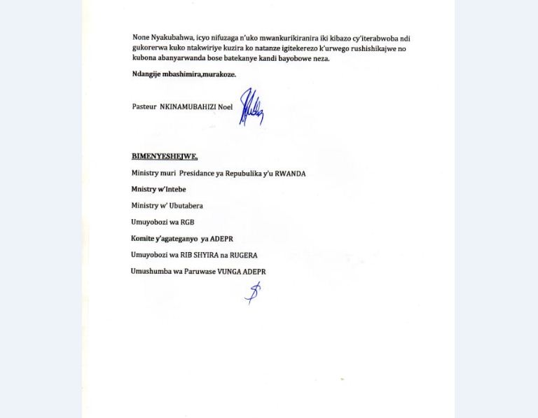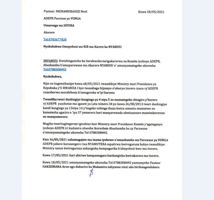 Indi baruwa nayo Ikinyamakuru Umusingi gifite kopi n’iyabavugabutumwa muri ADEPR n’Abapasteur bandikiye Minisitiri muri Peresidance bamutakambira bamusaba ikurwaho rya Komite nyobozi ya ADEPR yashyizweho na RGB ikurwaho .