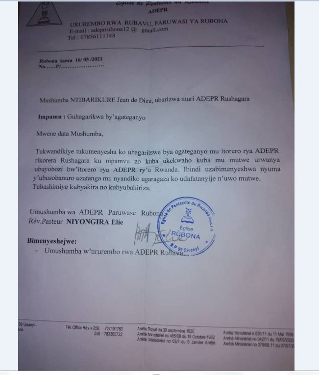 Mu maruwa Ikinyamakuru Umusingi gifite hari ihagarika byagateganyo Umushumba Ntibarikure Jean de Dieu wo muri ADEPR Rushagara azira kurwanya ubuyobozi bw’Itorero aho mu ibaruwa bavuga ko ibindi azabimenyeshwa amaze kwandika ibaruwa yisobanura ,Iyi baruwa uyisesenguye ukaba wasanga yaranditswe nta makuru afatika bafite bisa nkaho babwiwe ko Ntibarikure arwanya ubuyobozi bagahita bamwandikira batabanje gusesengura.