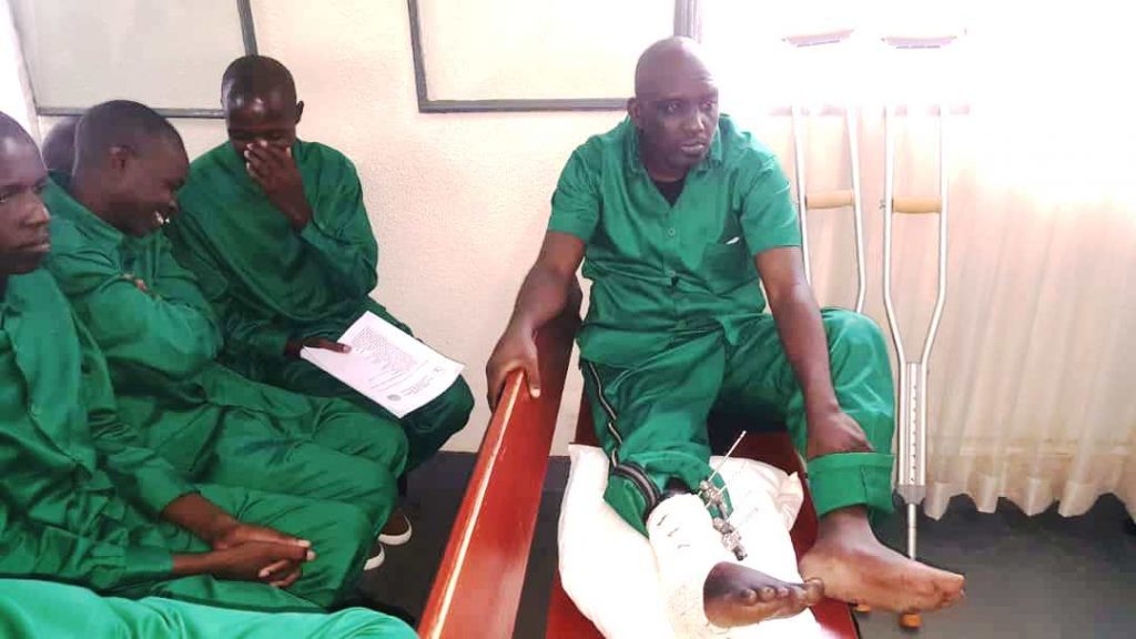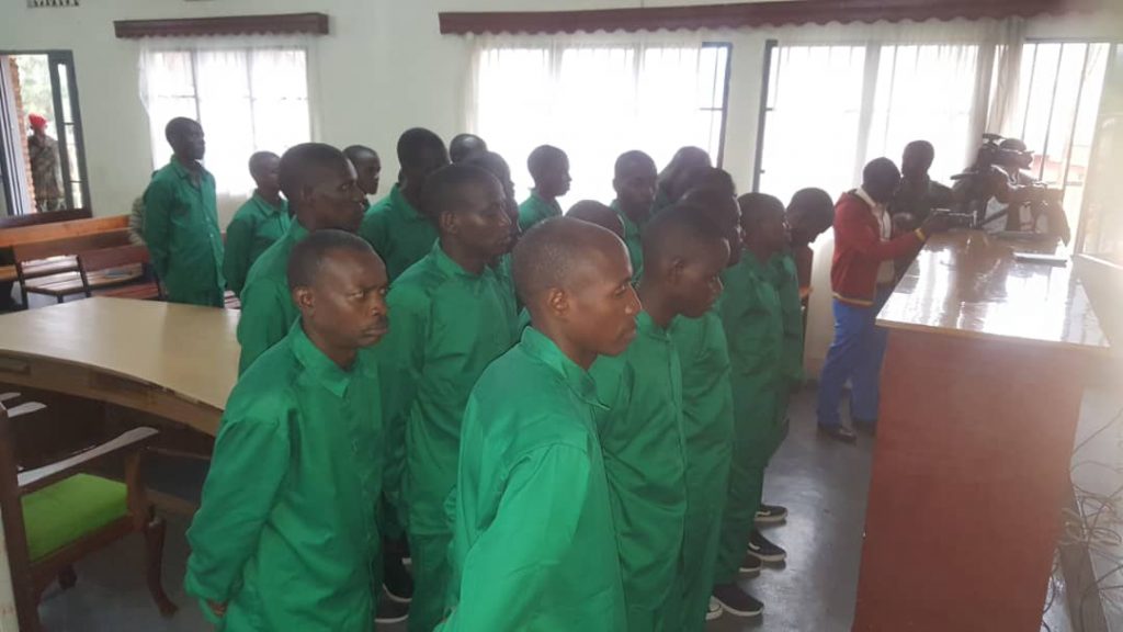 Urubanza rwa RNC: Abafashwe bagaruwe mu rukiko bambitswe imyambaro y’imfungwa za gisirikare.
